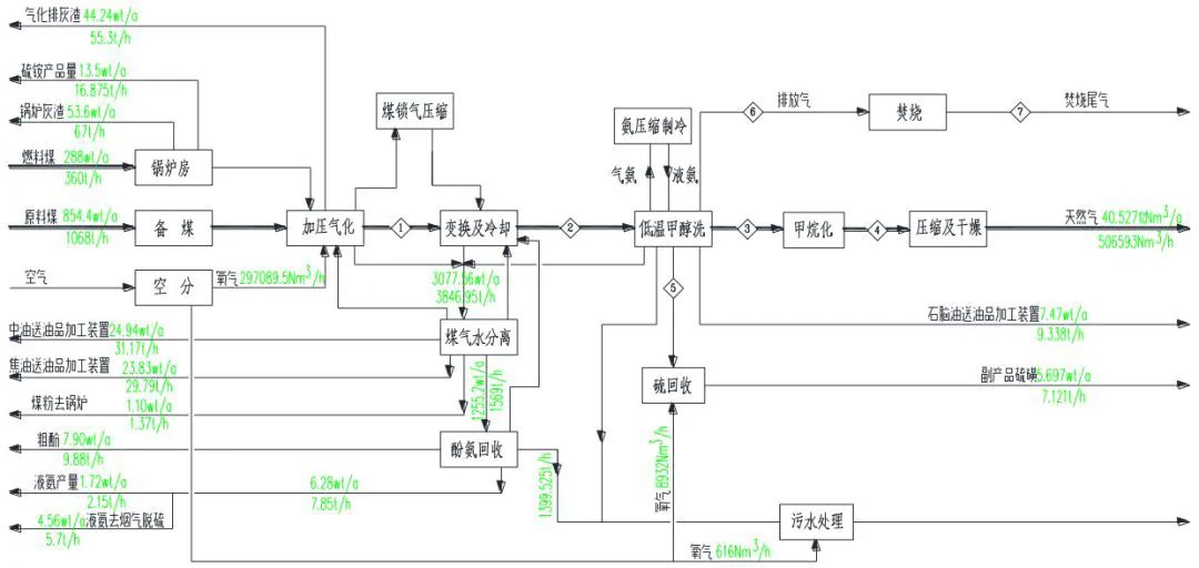 該項目將采用碎煤加壓氣化技術生產粗合成氣,通過變換調整氫碳比以滿足甲烷化合成天然氣的需要,采用低溫甲醇洗工藝脫除H2S和CO2。凈化后的合成氣在催化劑作用下進行甲烷化反應。建設內容包括氣化裝置、凈化裝置、甲烷化裝置、空分裝置等主要生產裝置及熱電工程等公用工程、輔助生產設施。