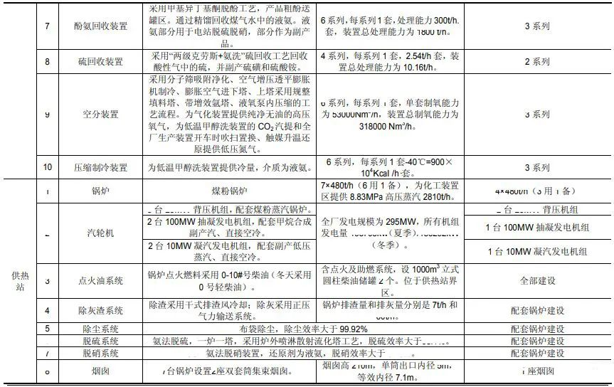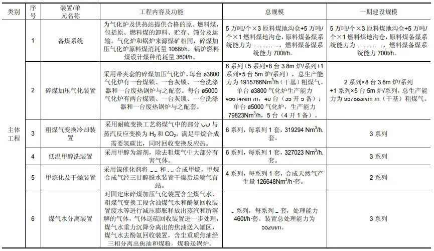 主體工程主要包括碎煤加壓氣化、凈化、甲烷化、酚氨回收、硫回收、空分、備煤等裝置。公輔工程主要包括燃煤鍋爐、汽輪發電機組、罐區、煤倉、脫鹽水站、循環水系統、火炬系統等。環保工程主要包括污水處理系統、回用水系統、蒸發結晶裝置、廢氣處理裝置、油氣回收裝置等。主要產品為40億立方米/年合成天然氣,副產品主要包括焦油、中油、石腦油、硫磺等。工程分兩期建設,一、二期生產能力均為20億立方米/年。
